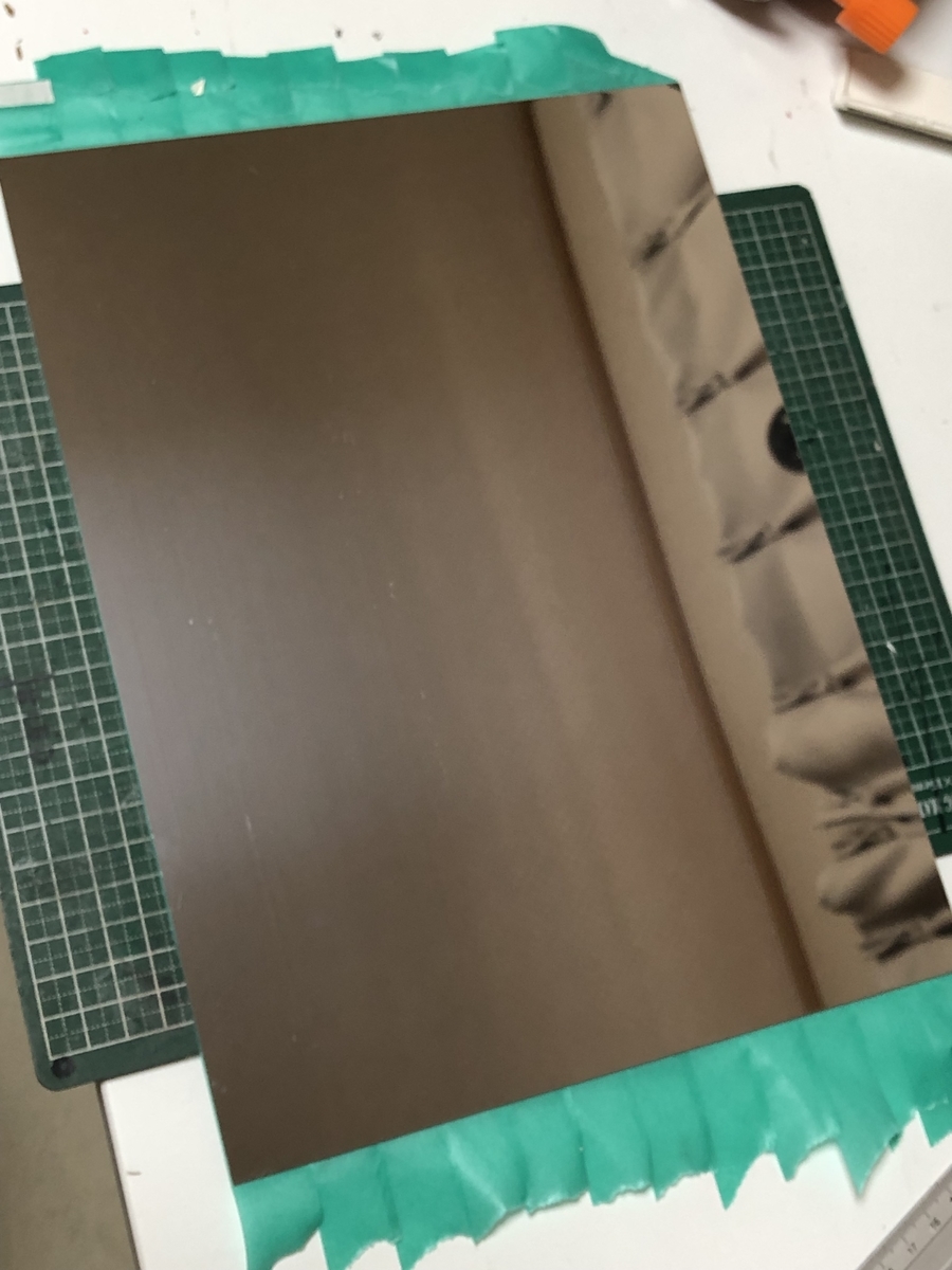 まず、ステンレス板の表面に傷防止のマスキングテープを貼っていきます。